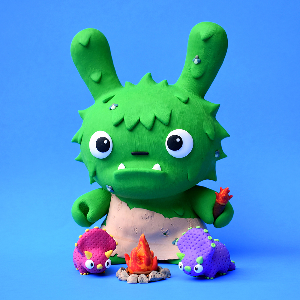 This monster is a customized Dunny completely covered and sculpted with polymer clay. He stands about 8 inches tall (20.32 cm).