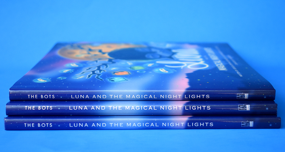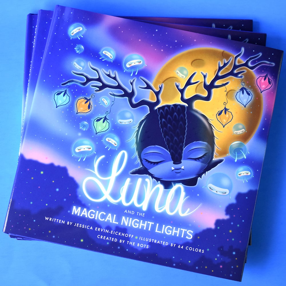 Written by The Bots and illlustrated by 64 Colors, this hardback book features 12 full color spreads and a unique story that is perfect for all ages. Wrapped in a cloth cover that is embossed with Luna herself, this book is the full package even coming with a dust jacket.